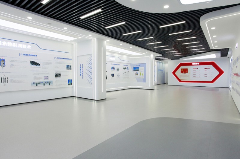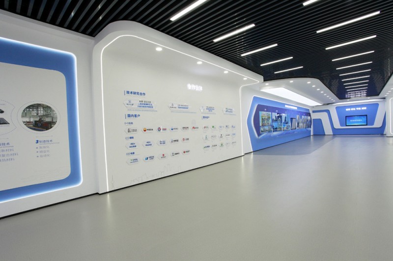 頂和地面造型統(tǒng)一,白色吊頂和灰色橡膠地面,黑色方鋼吊頂和灰色橡膠地面相互呼應(yīng),統(tǒng)一中富有變化,變化中又蘊(yùn)含統(tǒng)一,使整個展廳科技意境深遠(yuǎn)悠長。